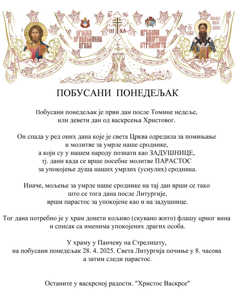 на побусани понедељак 28. 4. 2028. Света Литургија почиње у 8. часова