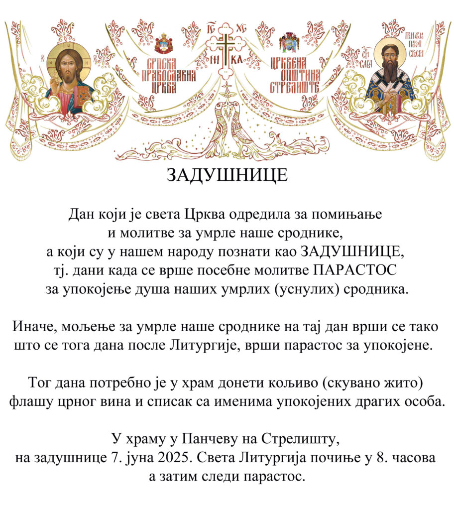 на задушнице 7. јуна 2025. Света Литургија почиње у 8. часова